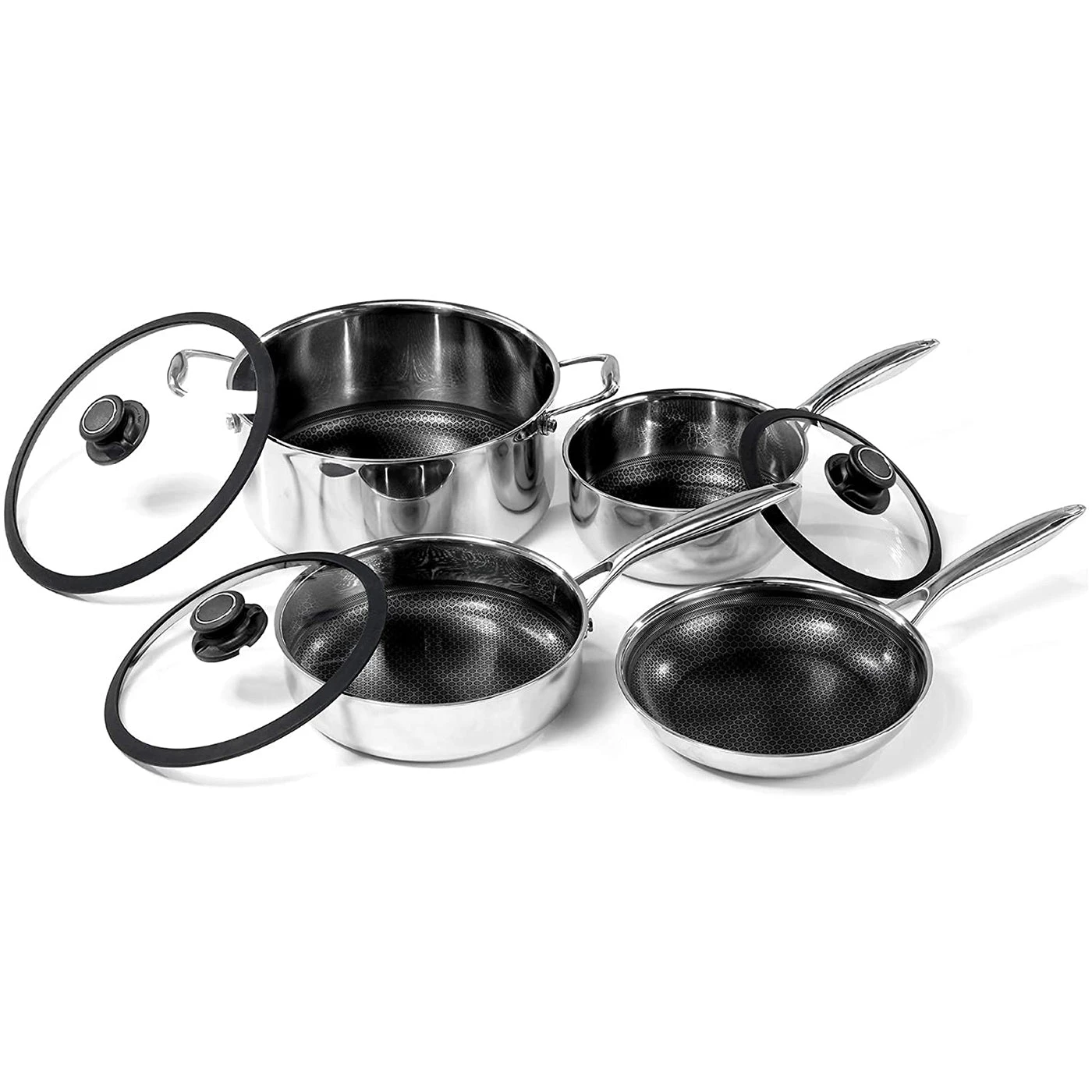 Stainless Nonstick is a raised stainless steel pattern over a recessed layer of nonstick coating. This allows for browning on stainless steel without sticking and protects the nonstick coating when using metal utensils.